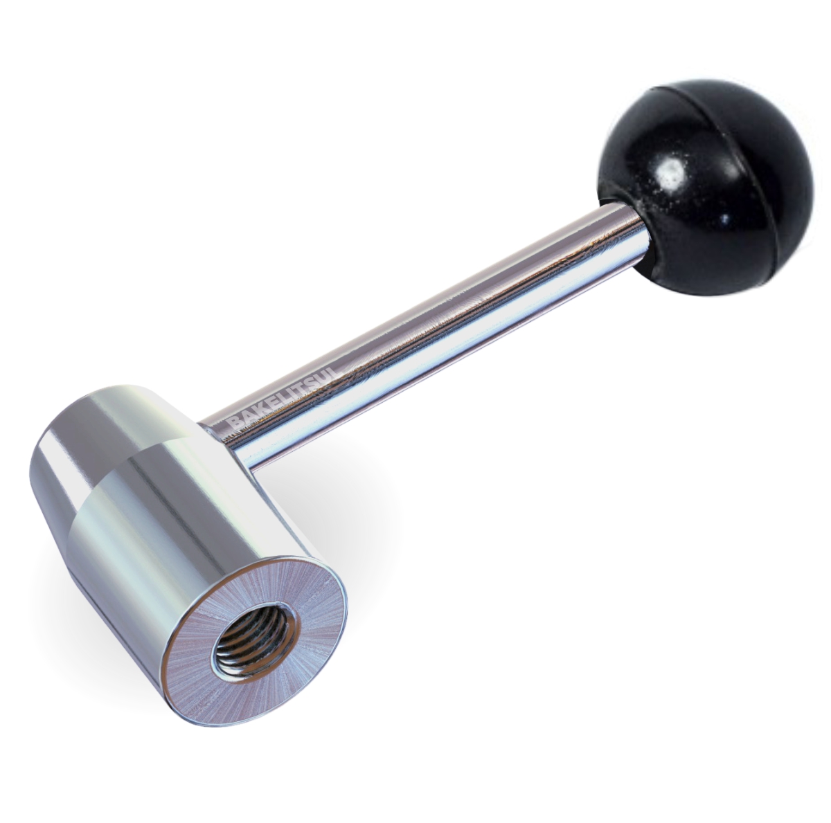 Ajustador tipo alavanca trava SEM catraca, fabricado em aço baixo carbono, acabamento superficial zincado trivalente branco. Ponta de haste fabricada em baquelite com acabamento superficial preto liso.
