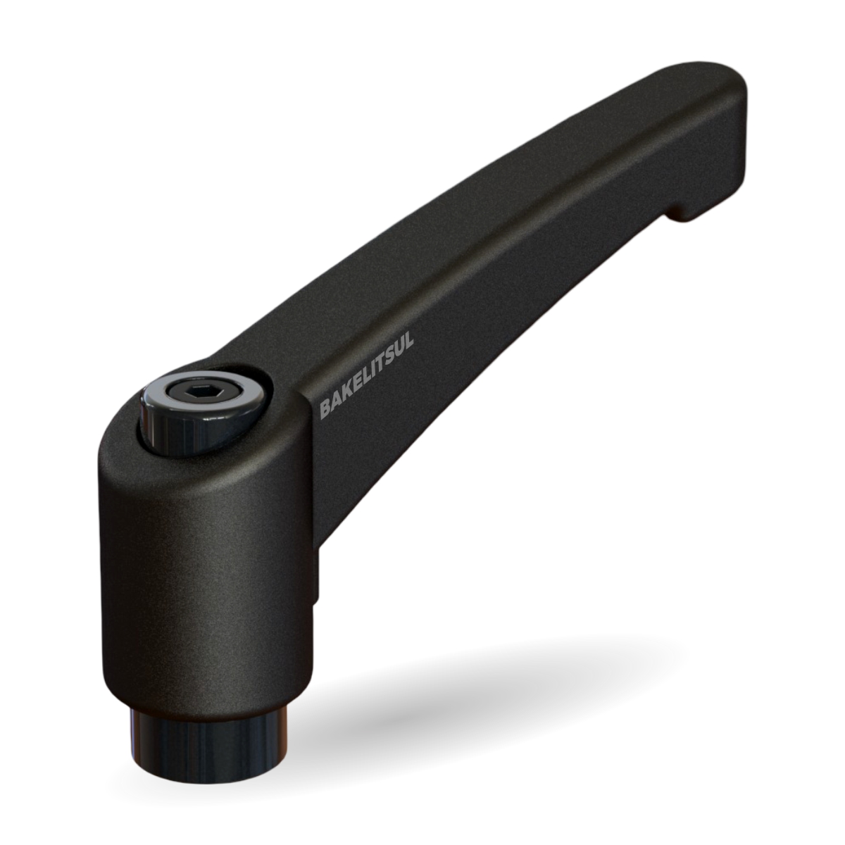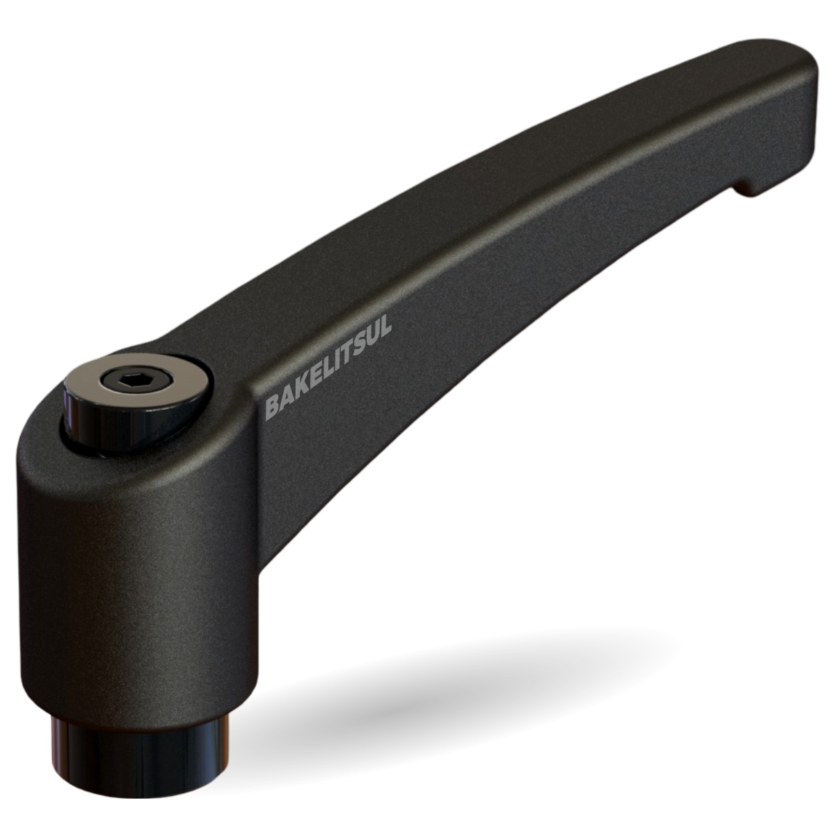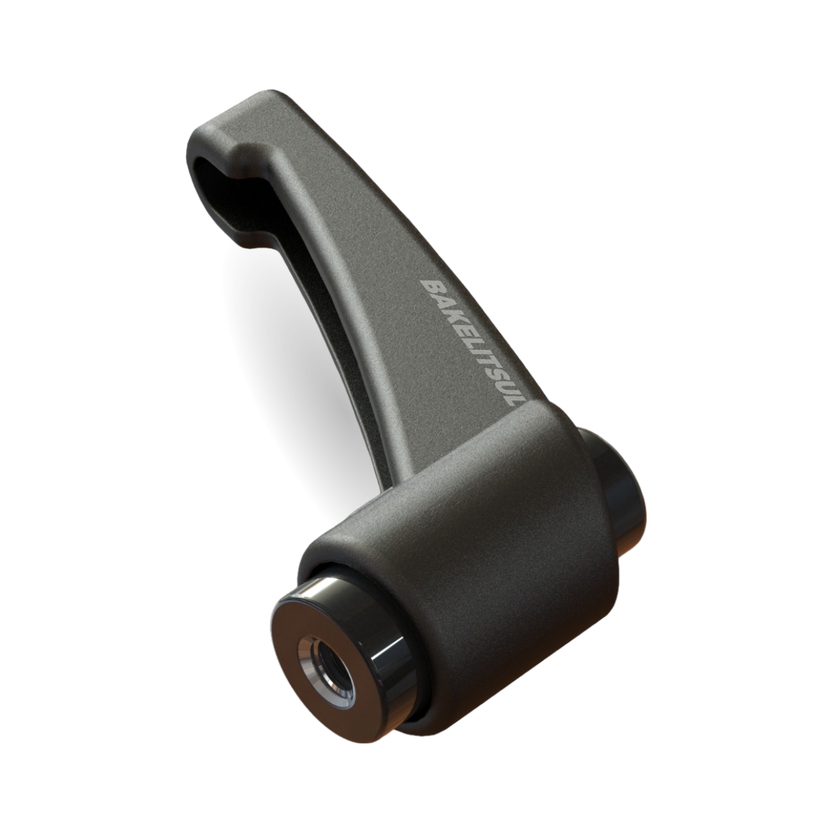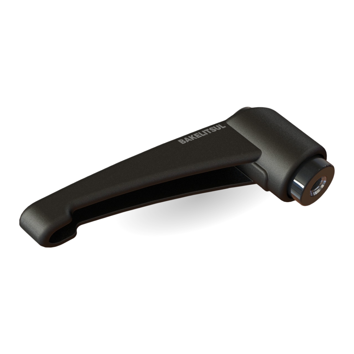 Maçaneta injetada em polímero plástico, acabamento superficial texturizado em preto. Conjunto interno de catraca injetado em zamak (*), mola e parafuso sextavado interno de fixação do conjunto em aço inoxidável AISI304.