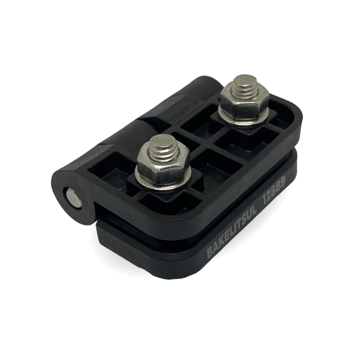 Injetado em tecnopolimer(*) reforçado com 30% de fibra de vidro acabamento texturizado preto. Pino central, parafusos porcas e arruelas em aço carbono zincado branco/amarelo ou aço inoxidável AISI304.