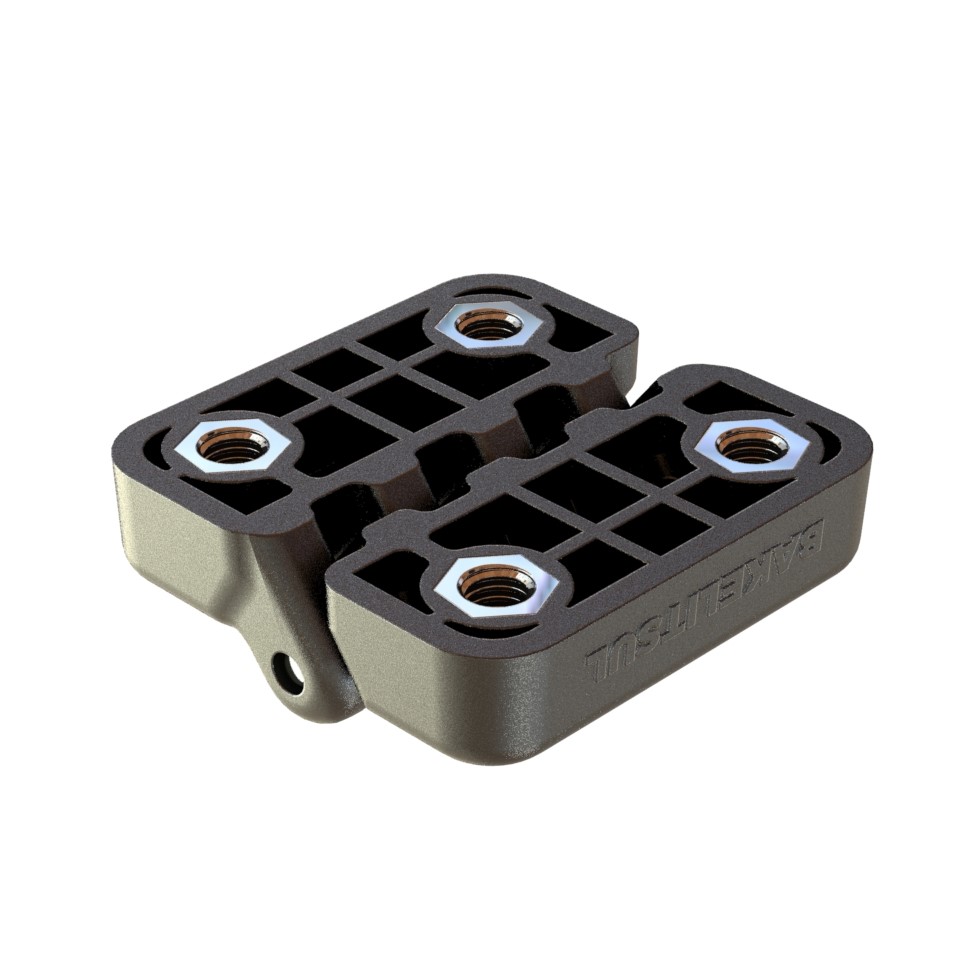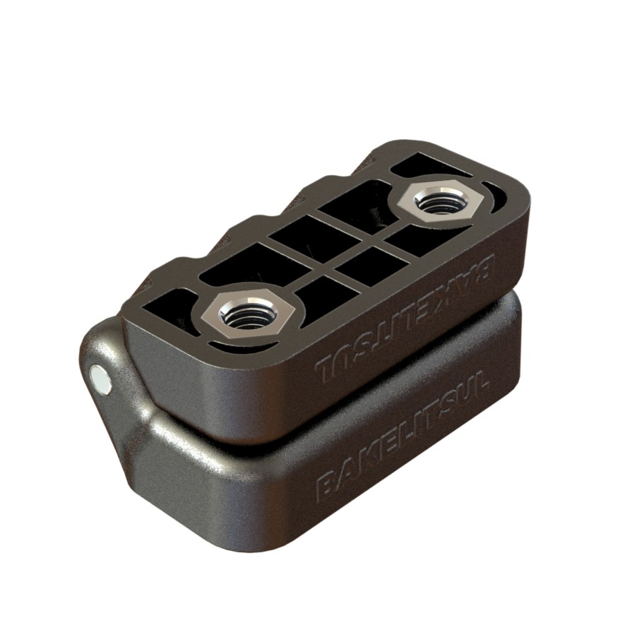 Injetado em tecnopolimer(*) reforçado com 30% de fibra de vidro acabamento texturizado preto, pino central em aço inoxidável AISI304, porcas embutidas em aço baixo carbono zincado branco.