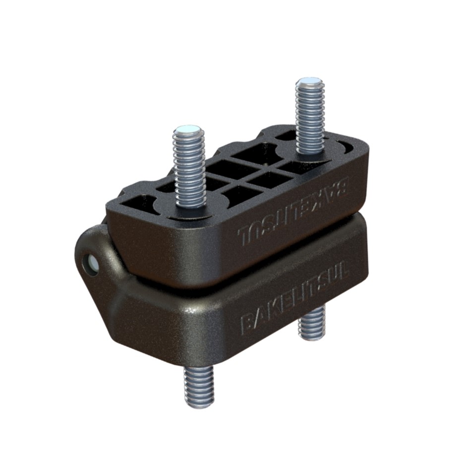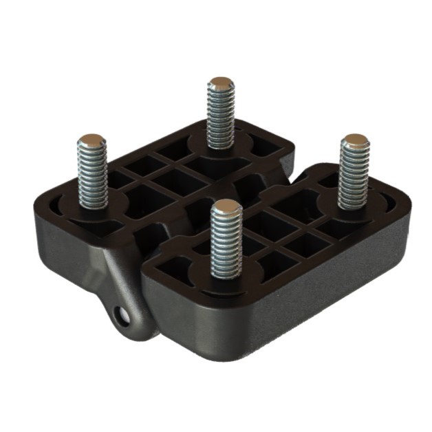 Injetado em tecnopolimer(*) reforçado com 30% de fibra de vidro acabamento texturizado preto, pino central em aço inoxidável AISI304, pinos roscados em aço baixo carbono zincado branco.