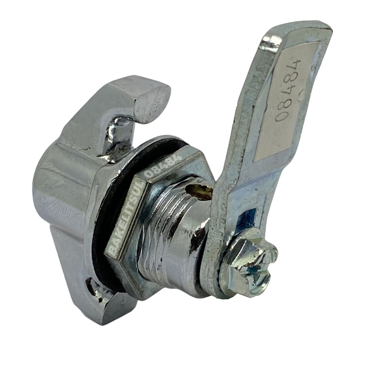 Manopla, bucha e porca injetados em zamak(*). Acabamento superficial da manopla e bucha cromado ou pintado em preto. Lingueta confeccionada em aço carbono (**) com espessura de 4mm. Porca e lingueta zincado trivalente. Proteção da lingueta em tecnopolímer(***) preto.