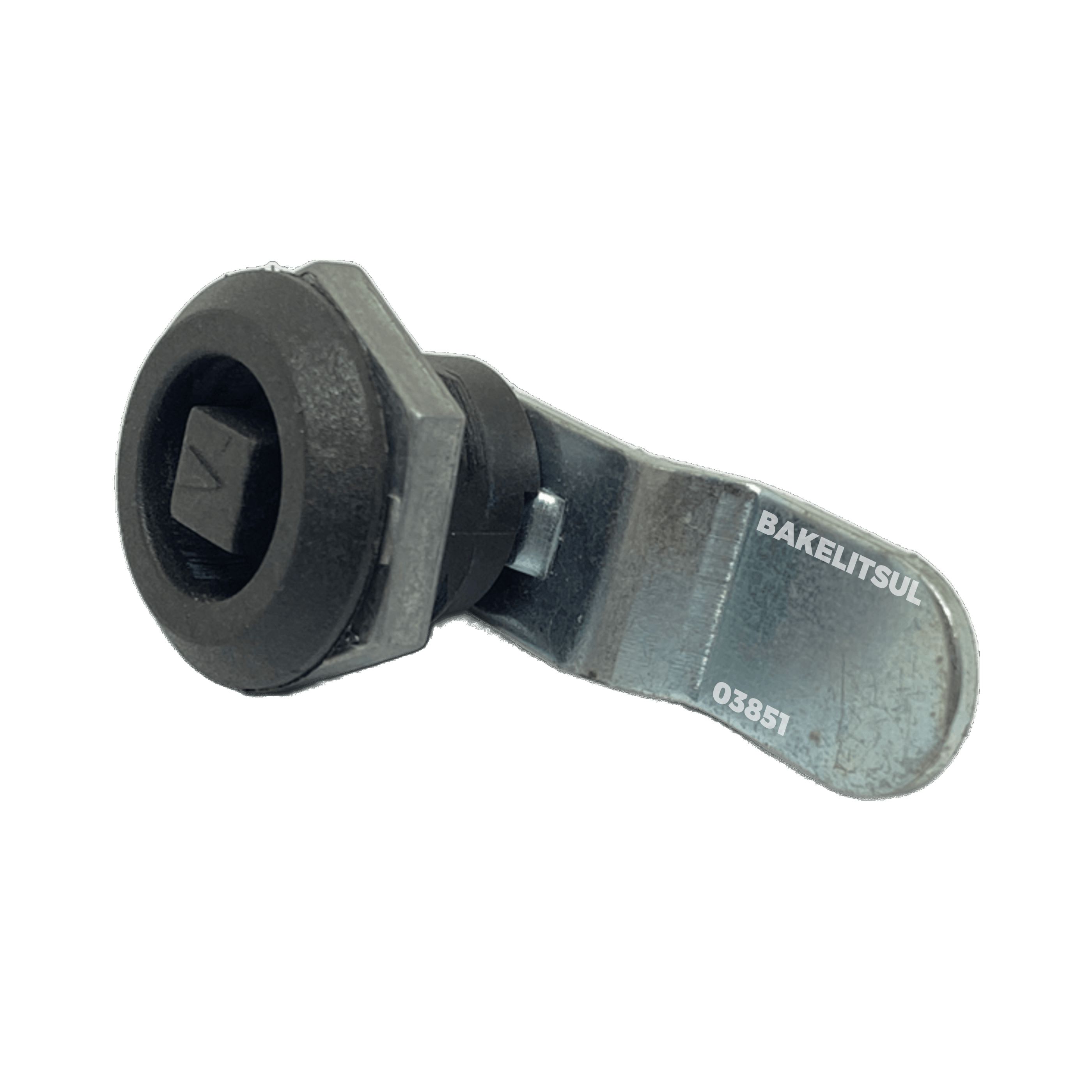 Código 03847 - Corpo em tecnopolímer(***) preto, inserto interno em zamak(*) zincado trivalente. Porca de fixação e lingueta em aço carbono(**) zincado trivalente.