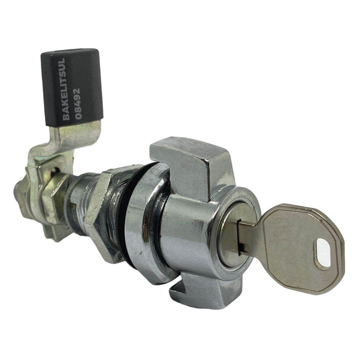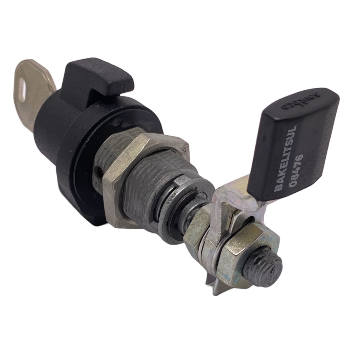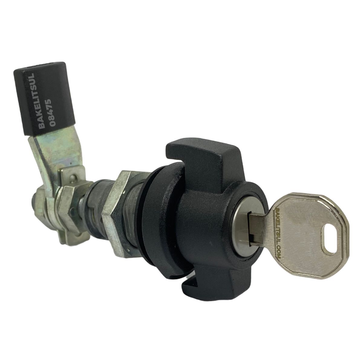 Manopla, bucha e porca injetados em zamak(*). Acabamento superficial da manopla e bucha cromado ou pintado em preto. Lingueta confeccionada em aço carbono (**) com espessura de 4mm. Porca e lingueta zincado trivalente. Proteção da lingueta em tecnopolímer(***) preto.