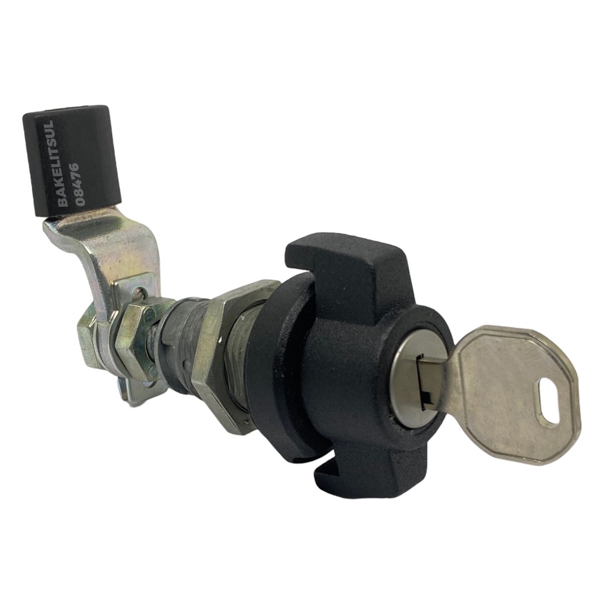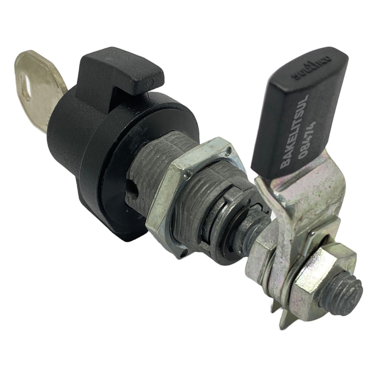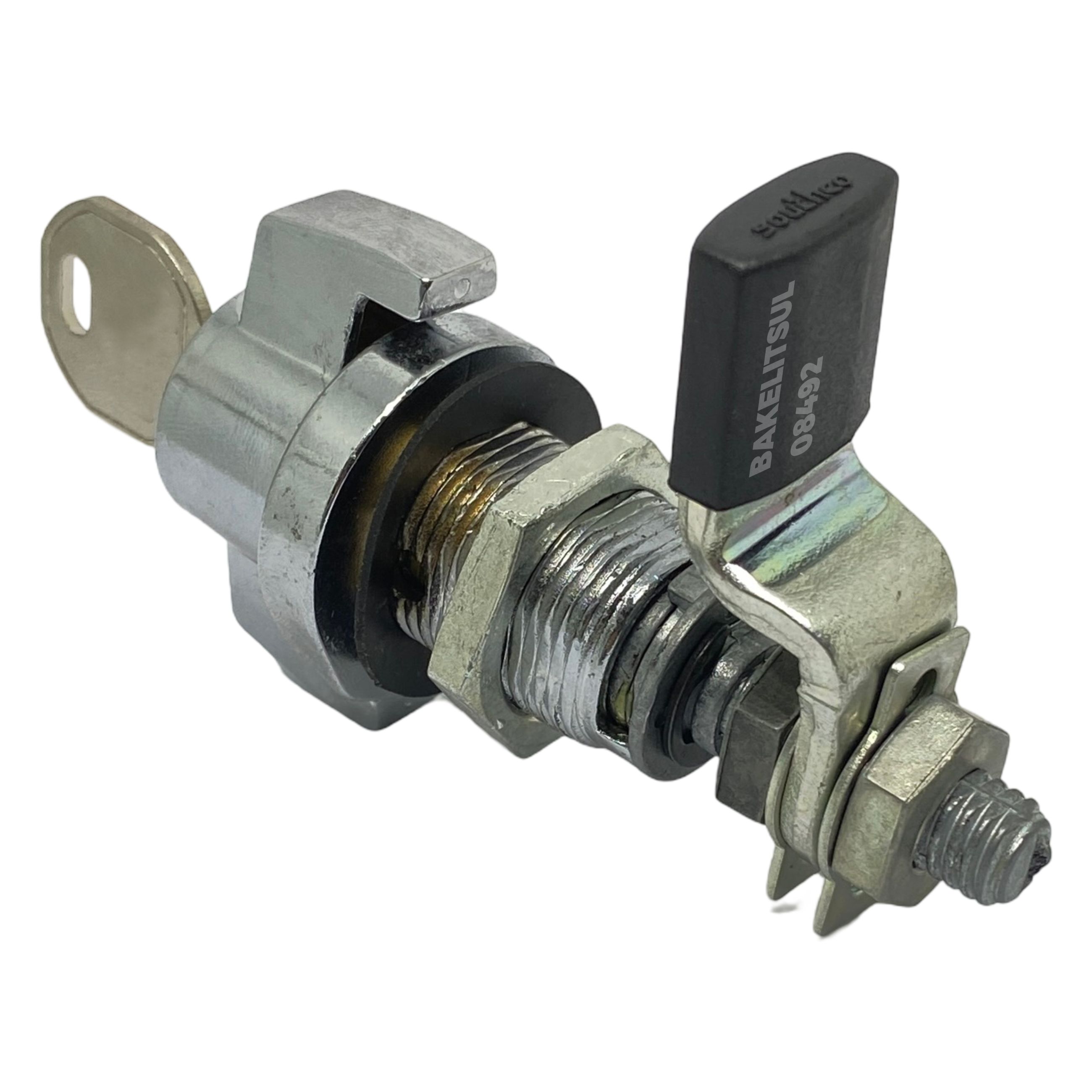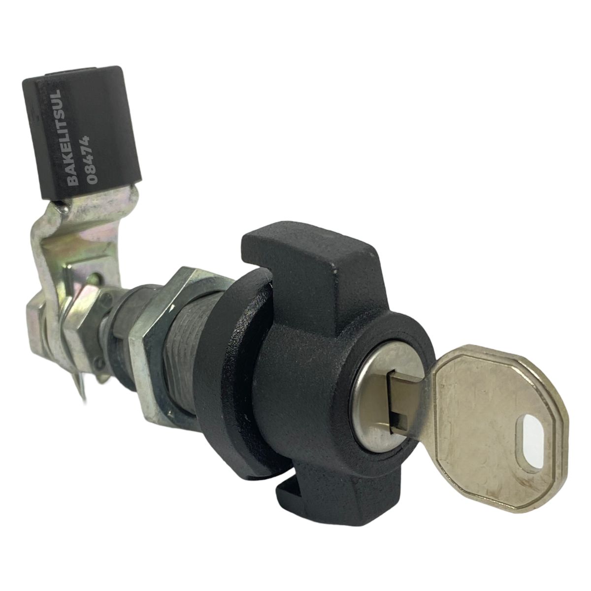 Manopla, bucha e porca injetados em zamak(*). Acabamento superficial da manopla e bucha cromado ou pintado em preto. Lingueta confeccionada em aço carbono (**) com espessura de 4mm. Porca e lingueta zincado trivalente. Proteção da lingueta em tecnopolímer(***) preto.