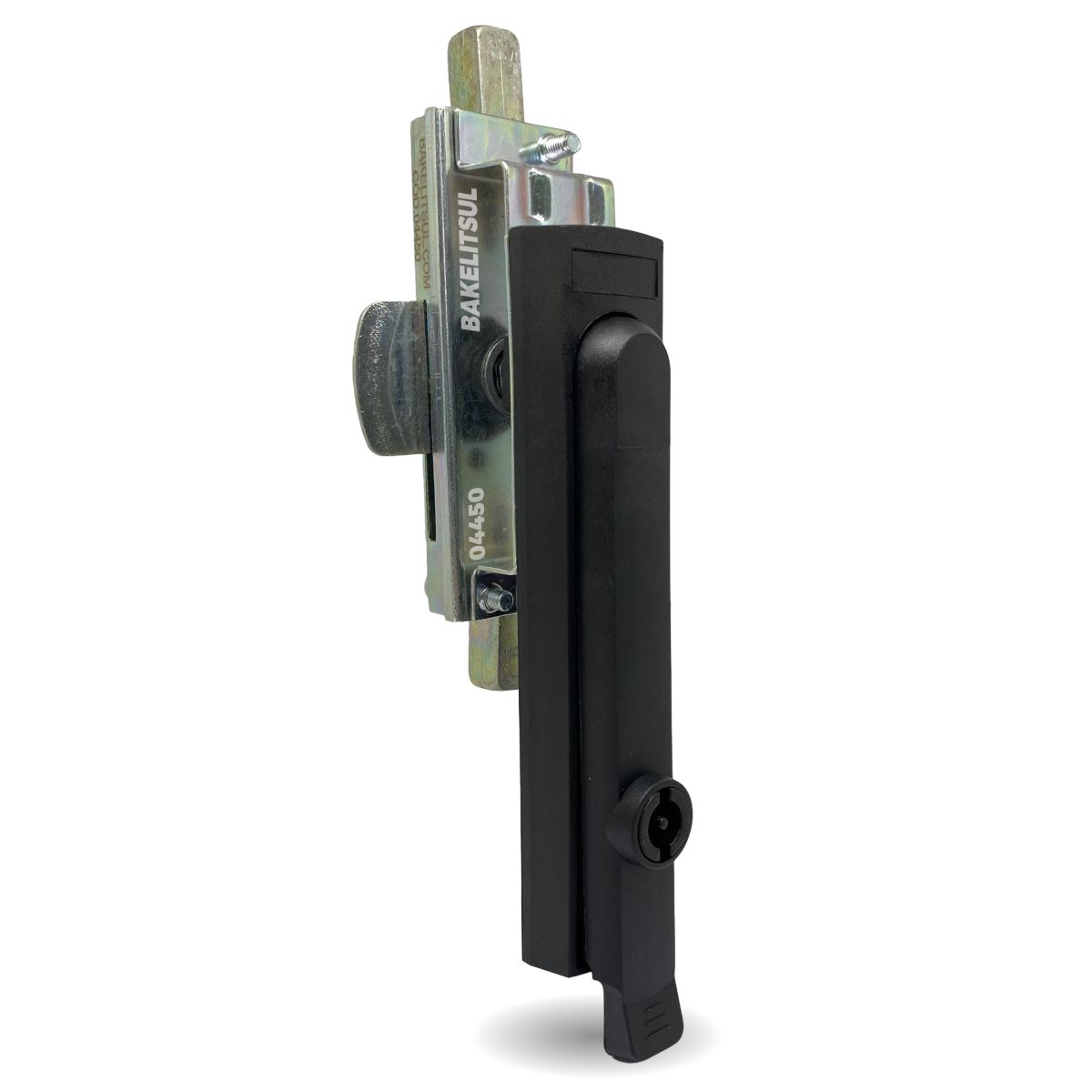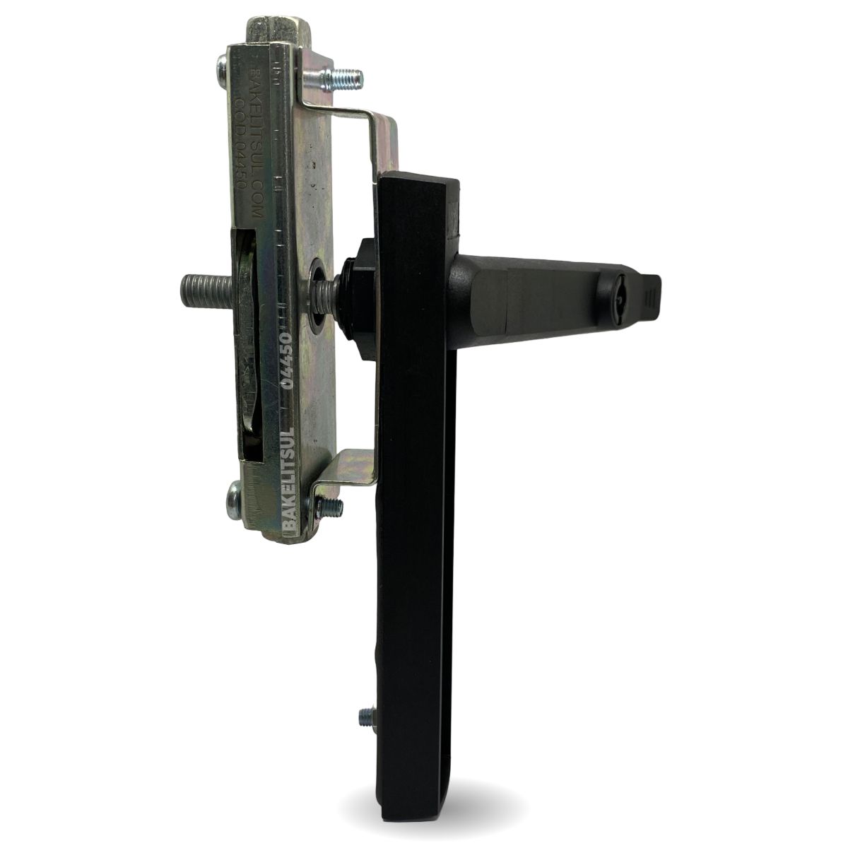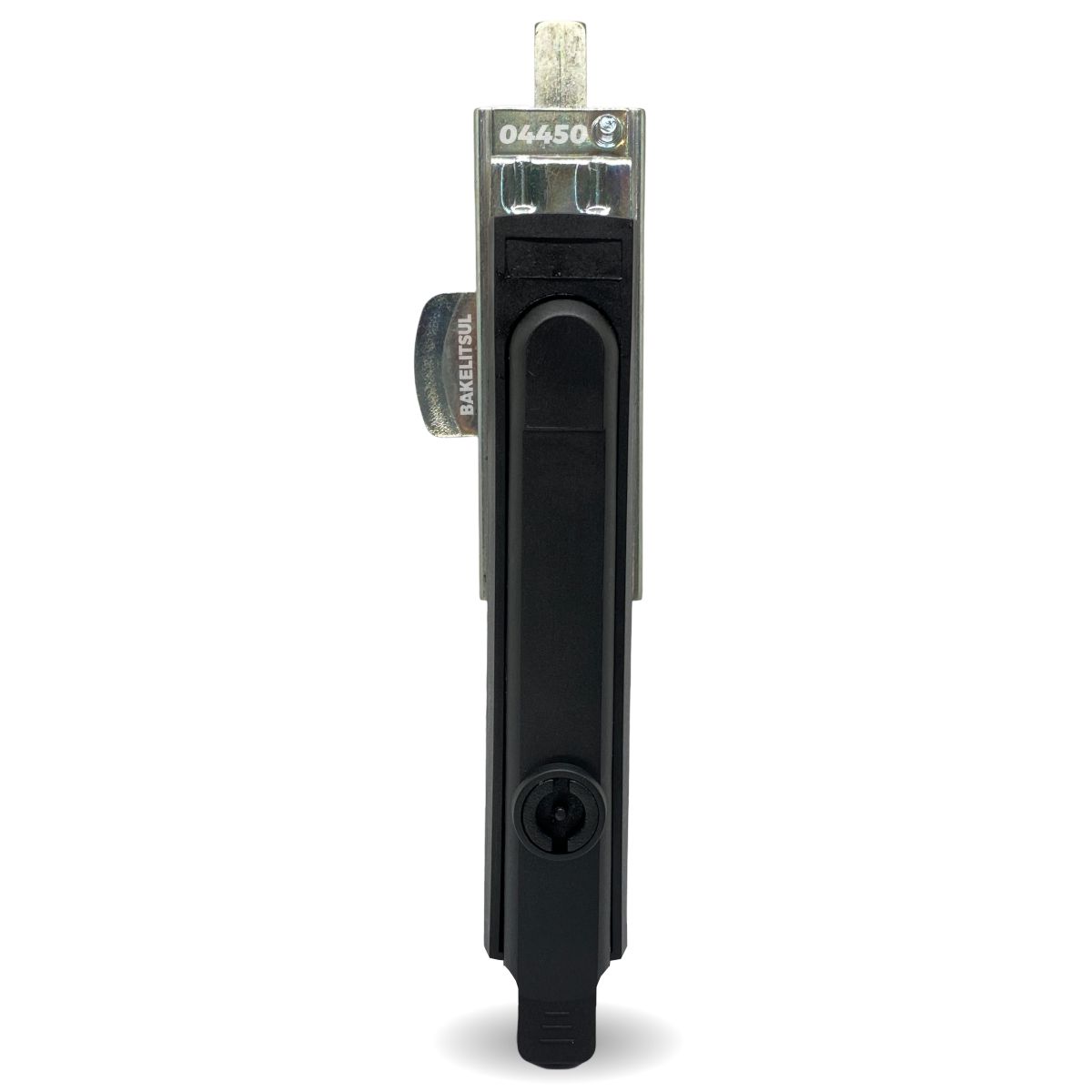Maçaneta em tecnopolimer (***) acabamento preto texturizado. Lingueta e porcas da
