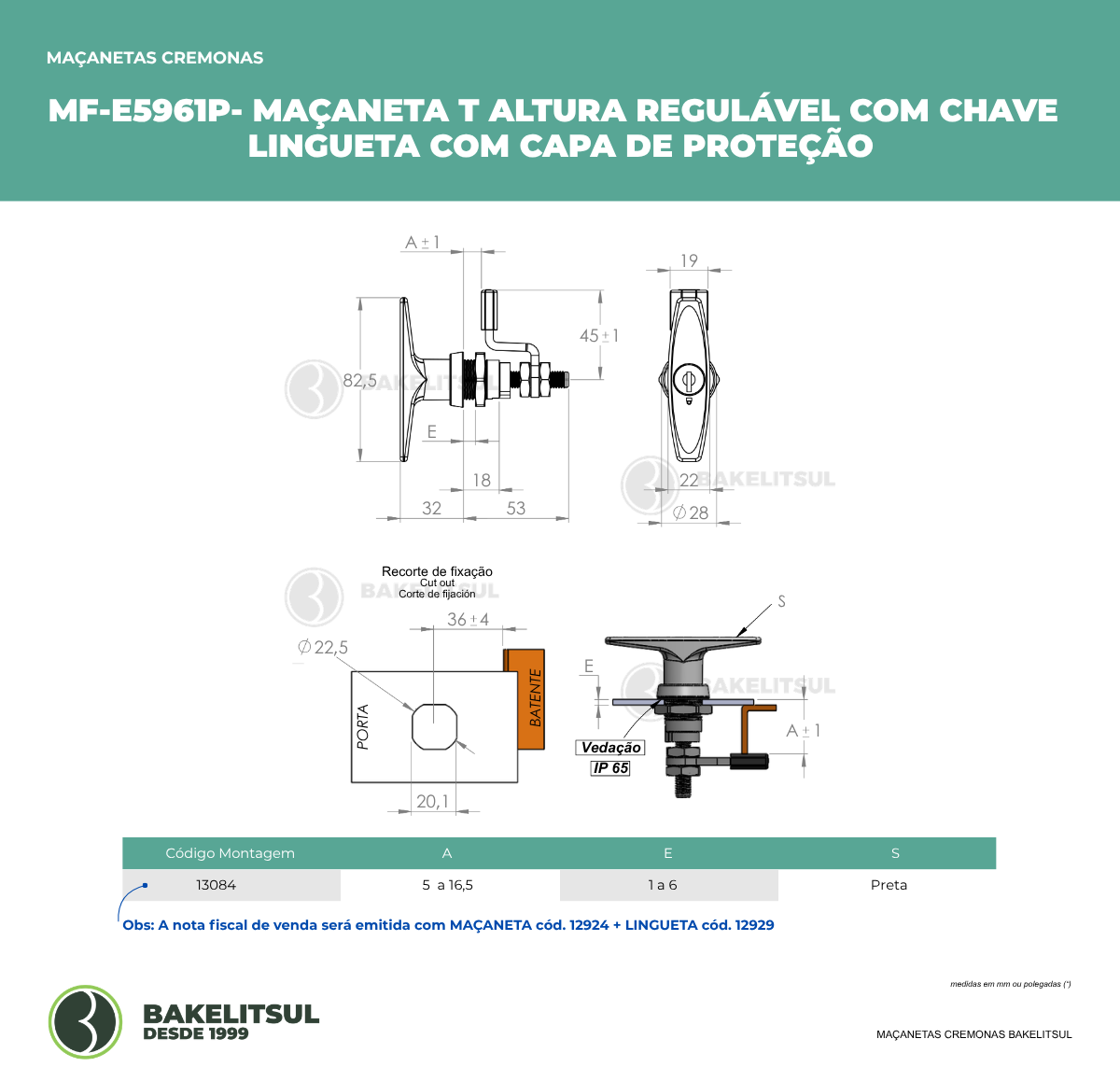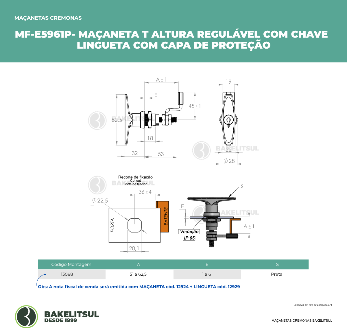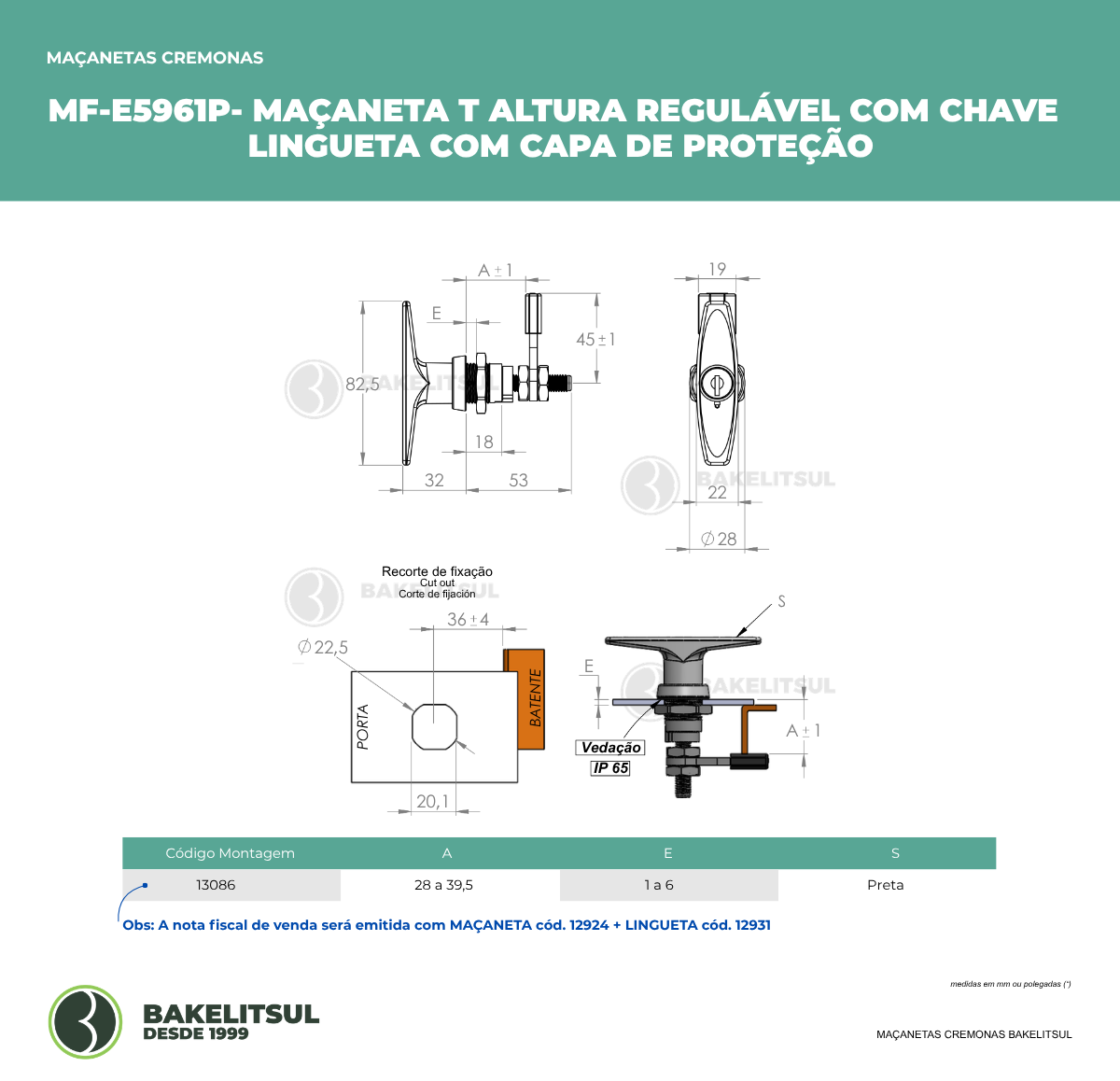 Cota “E” do desenho técnico refere-se a espessura máxima da estrutura para a montagem da maçaneta.