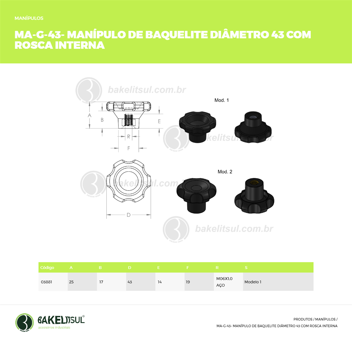 Manípulos BakelitSul, são peças utilizadas para apertos, desapertos e regulagens em geral. Sua ergonomia facilita o uso sem a necessidade de ferramentas.