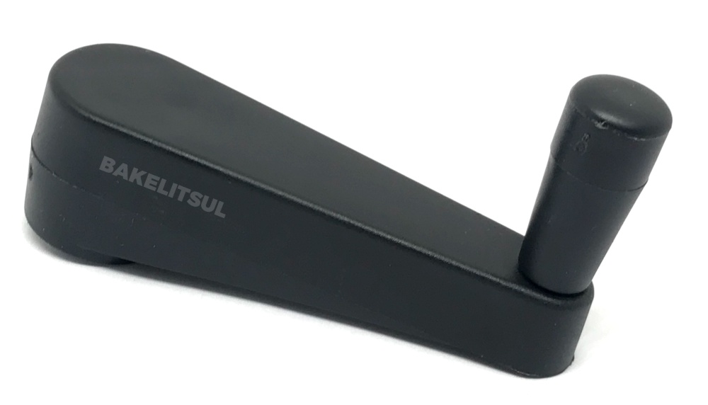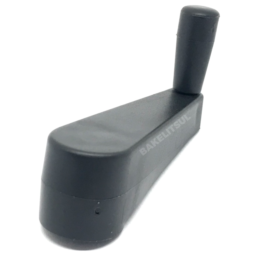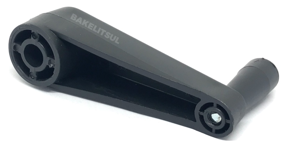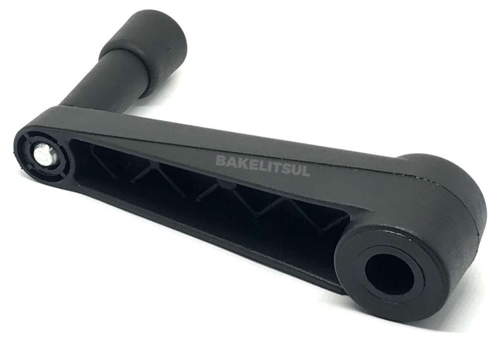 Manivela injetada em polímero plástico Tecnopolímer(*) reforçado com 30% de fibra de vidro, acabamento superficial texturizado preto.