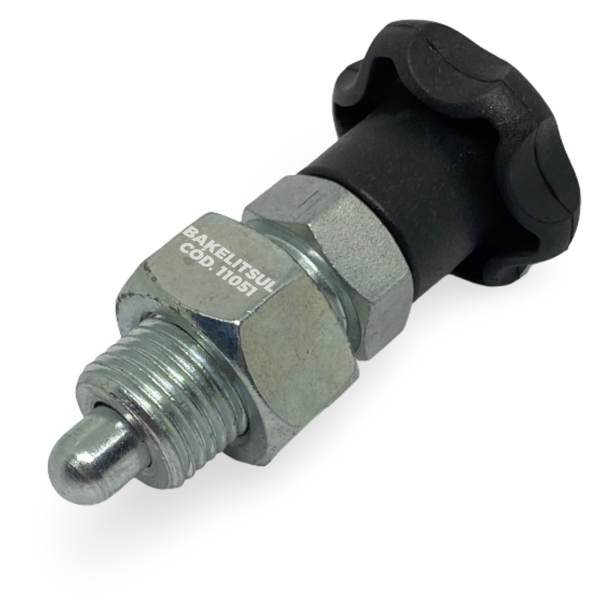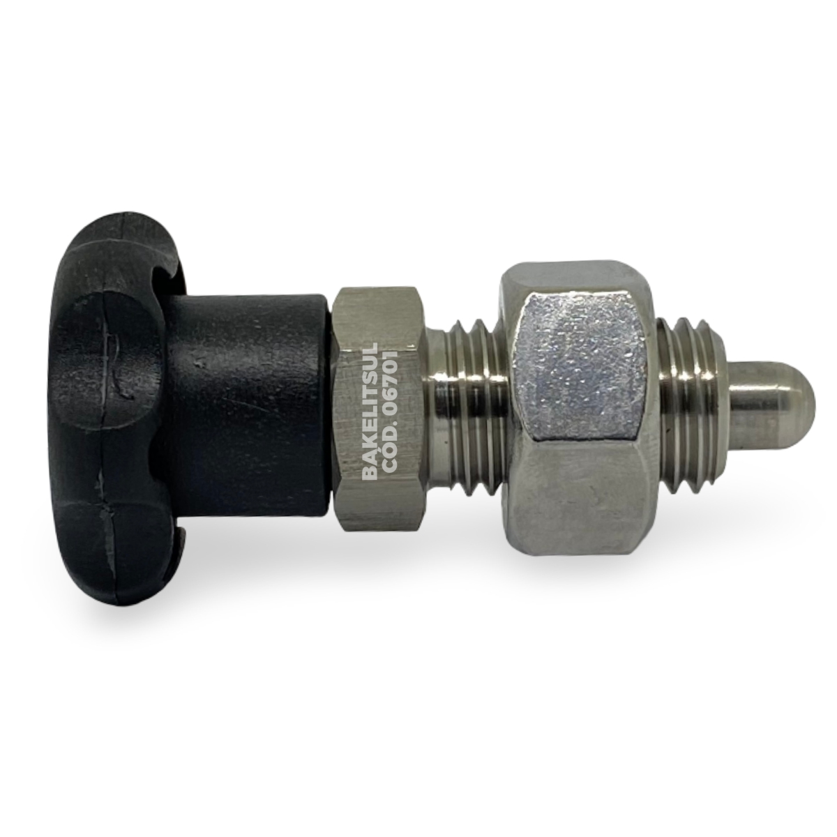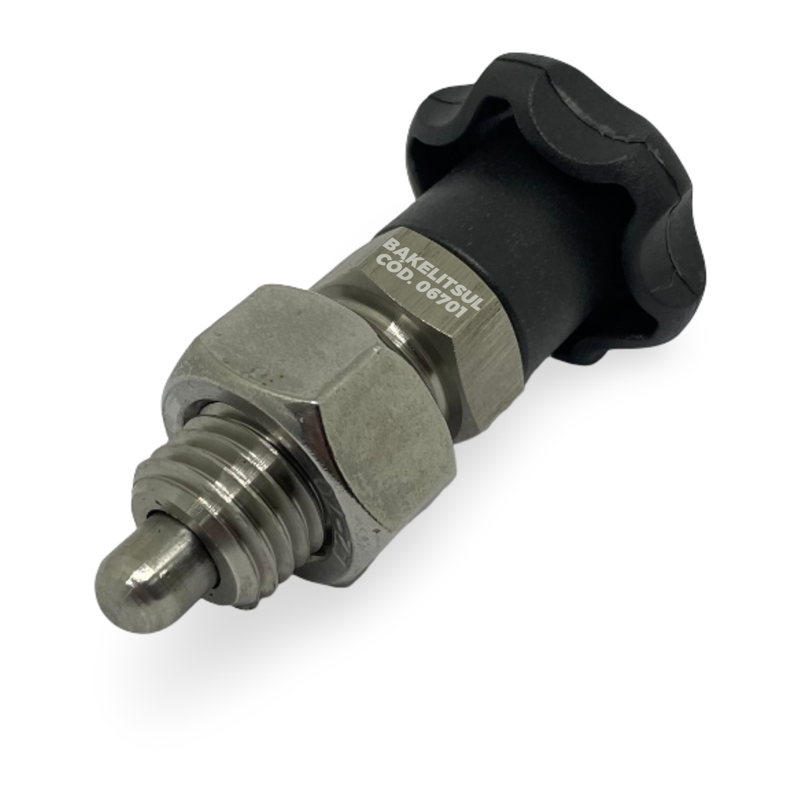 Manípulo de acionamento fabricado em Tecnopolimer(*) com acabamento superficial texturizado em preto. Componentes metálicos em aço baixo carbono (RAC) ou aço inoxidável (RIN) AISI304.