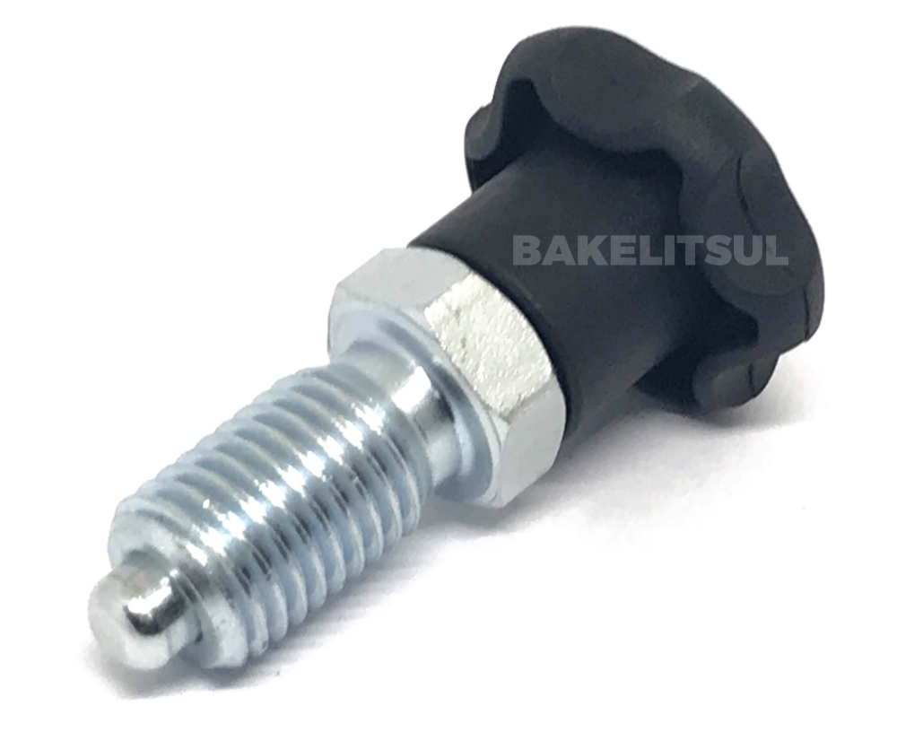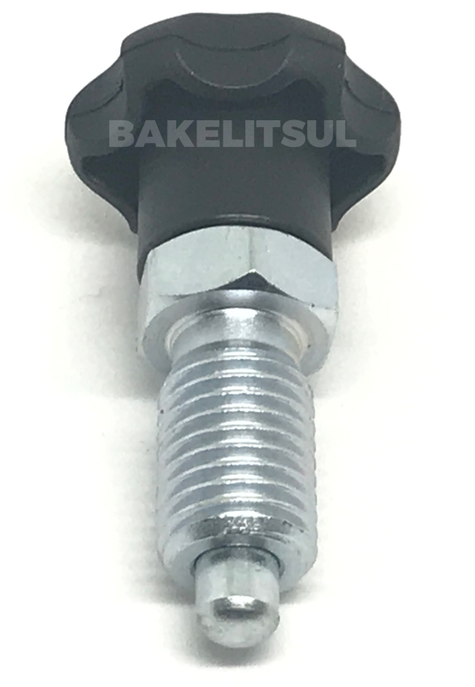 Botão posicionador indexador, com mola para avanço e recuo automático do pino interno. Utilizado para localizar, fechar, travar ou centralizar partes de máquinas e equipamentos em geral, mobília médico/hospitalar, equipamentos gastronômicos, aparelhos musicais, aparelhos de ginástica, etc.