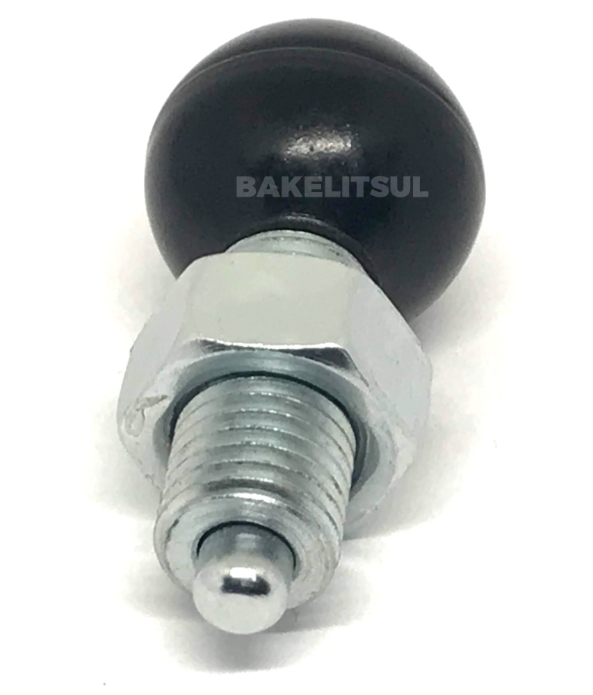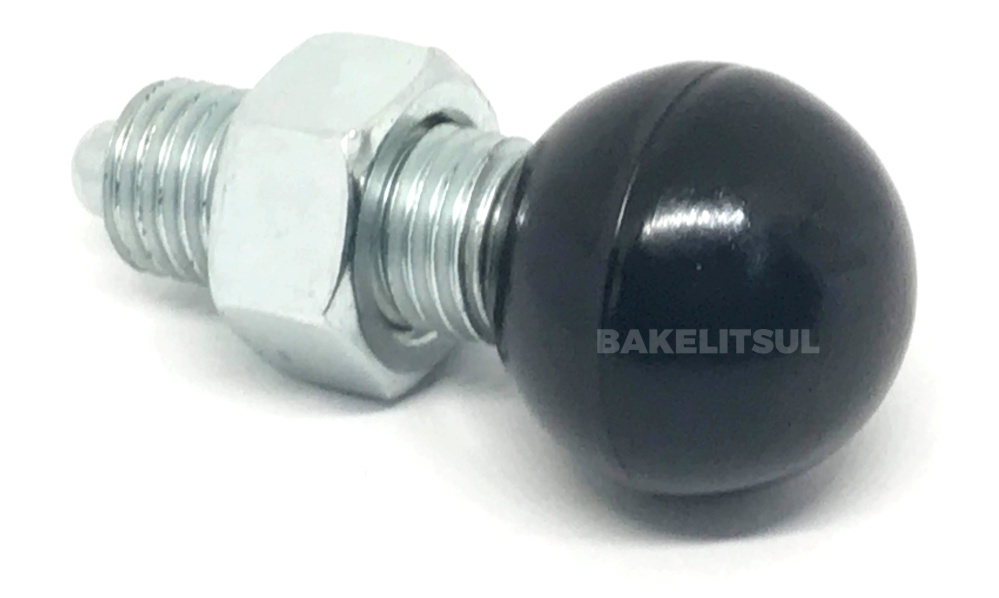 Esfera de acionamento fabricado em Baquelite(*) com acabamento superficial liso polido em preto. Componentes metálicos em aço baixo carbono (RAC) ou aço inoxidável (RIN) AISI304.