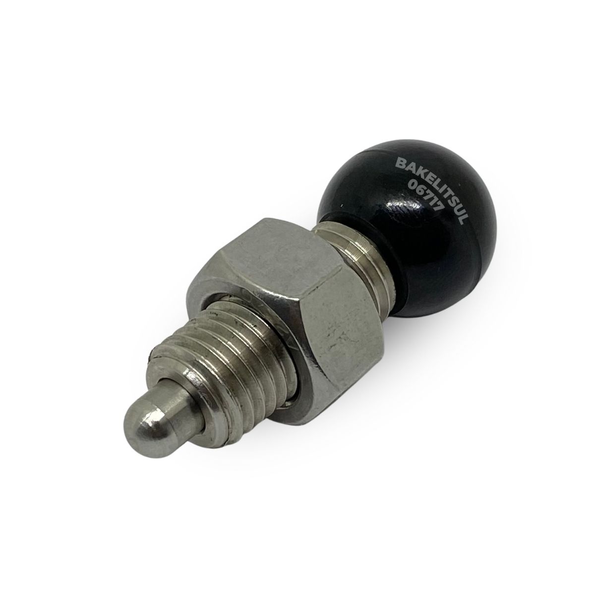 Botão posicionador indexador, com mola para avanço e recuo automático do pino interno. Utilizado para localizar, fechar, travar ou centralizar partes de máquinas e equipamentos em geral, mobília médico/hospitalar, equipamentos gastronômicos, aparelhos musicais, aparelhos de ginástica, etc.