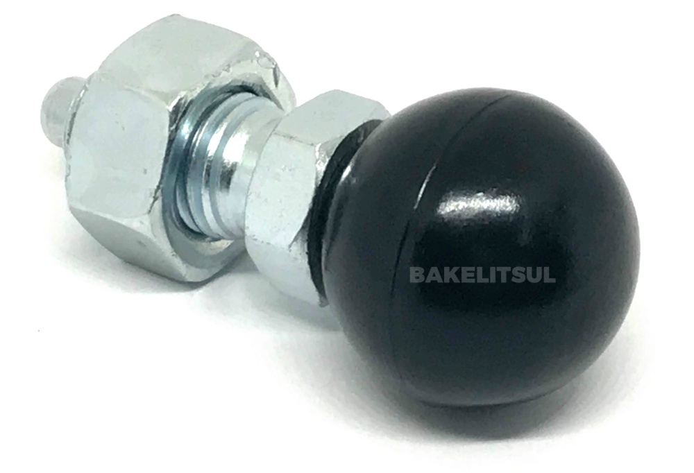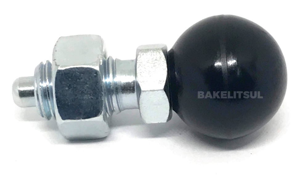 Esfera de acionamento fabricado em Baquelite(*) com acabamento superficial liso polido em preto. Componentes metálicos em aço baixo carbono (RAC) ou aço inoxidável (RIN) AISI304.