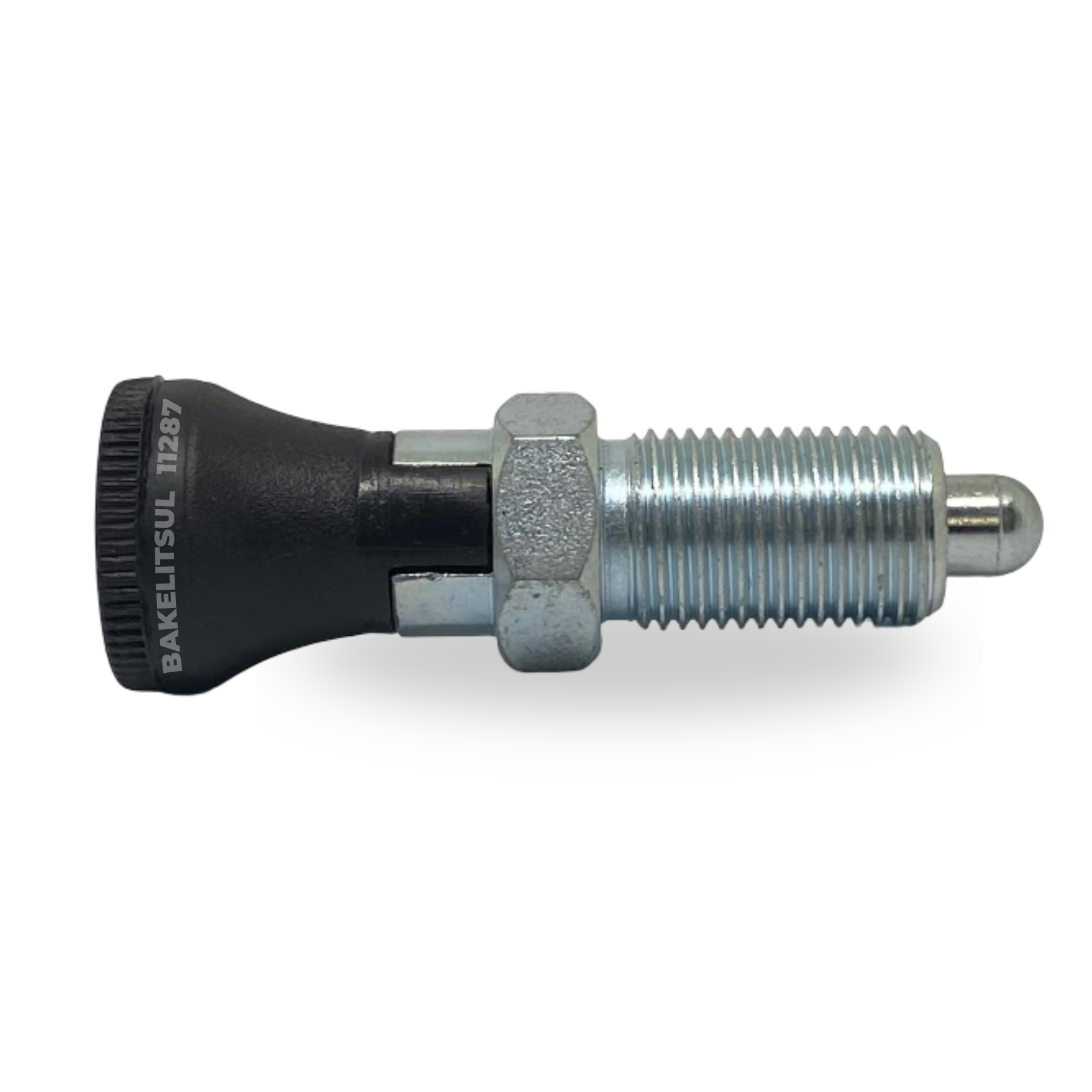 Manípulo de acionamento fabricado em Tecnopolimer(*) com acabamento superficial texturizado em preto. Componentes metálicos em aço baixo carbono (RAC) ou aço inoxidável (RIN) AISI304.