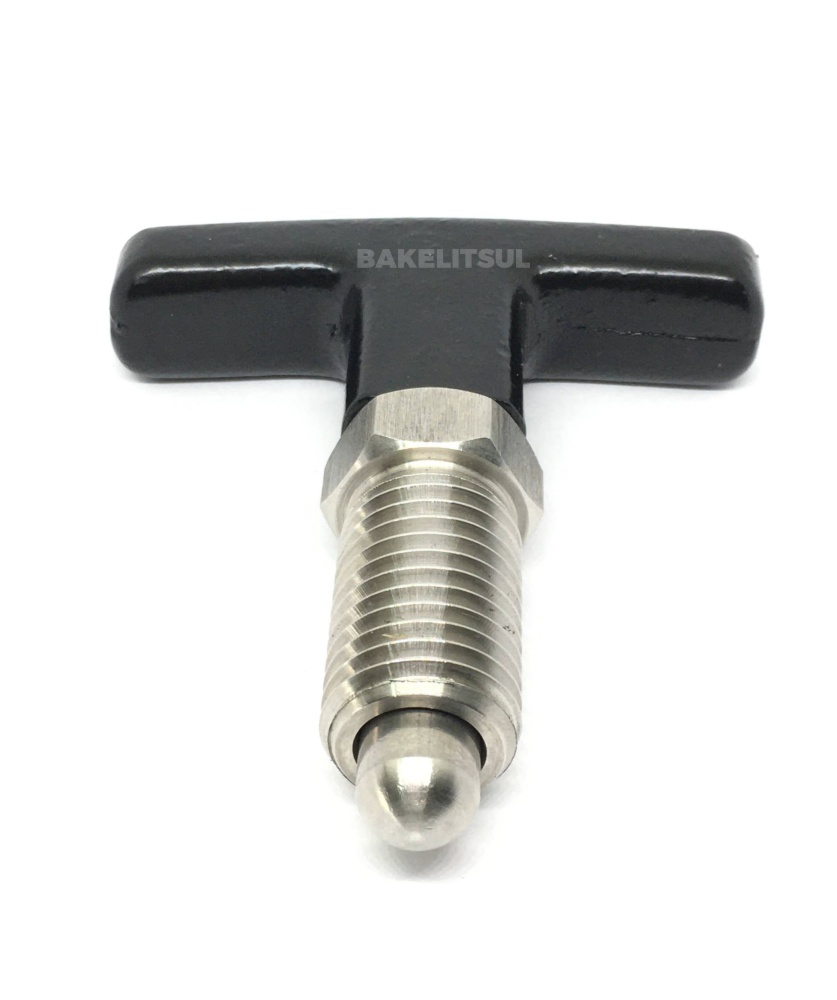 Botão posicionador indexador, com mola para avanço e recuo automático do pino interno. Utilizado para localizar, fechar, travar ou centralizar partes de máquinas e equipamentos em geral, mobília médico/hospitalar, equipamentos gastronômicos, aparelhos musicais, aparelhos de ginástica, etc.