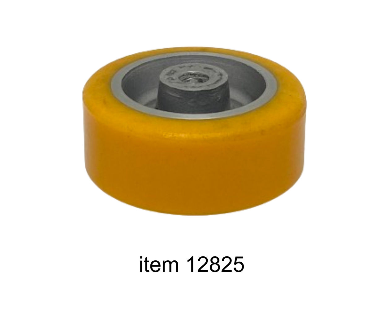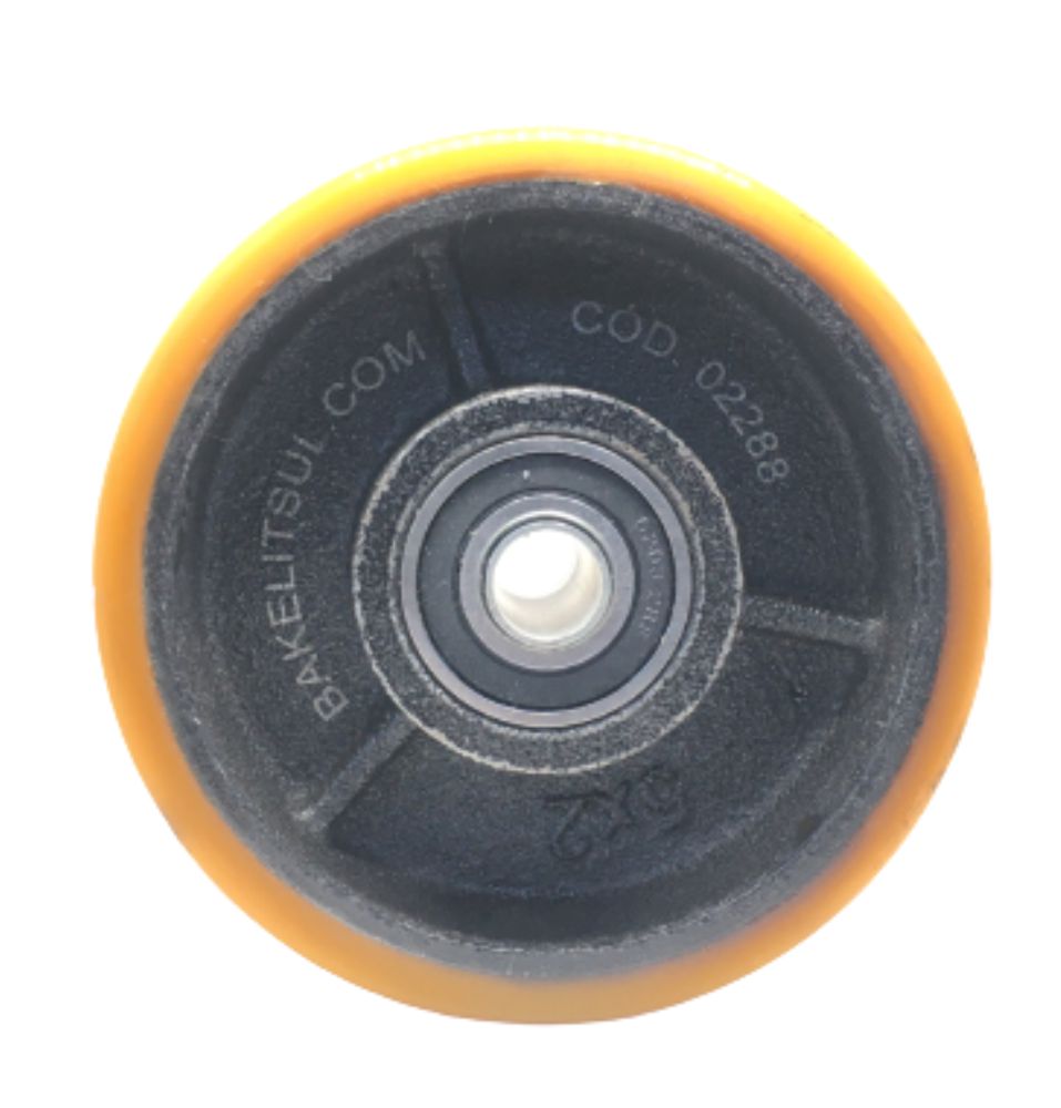 Aro fabricado em ferro fundido com acabamento pintado preto . Banda de rodagem em poliuretano moldado.