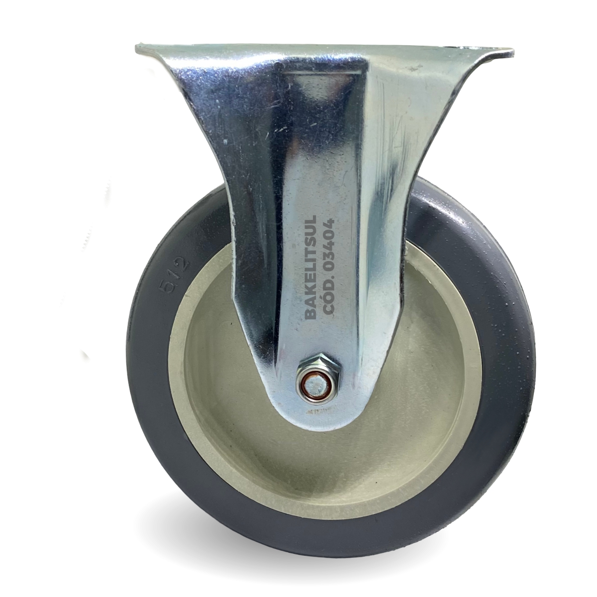 Suporte fabricado em chapa de aço carbono(*) estampado, acabamento zincado. Eixo da roda em aço carbono zincado parafusado. Roda fabricada em tecnopolimer(**) cinza.