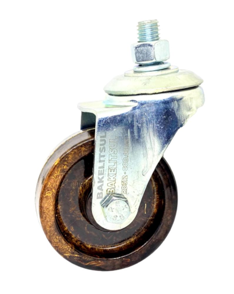 Suporte fabricado em chapa de aço carbono(*) estampado, acabamento zincado. Eixo da roda em aço carbono zincado parafusado. Roda fabricada em laminado fenólico(**) acabamento marrom.