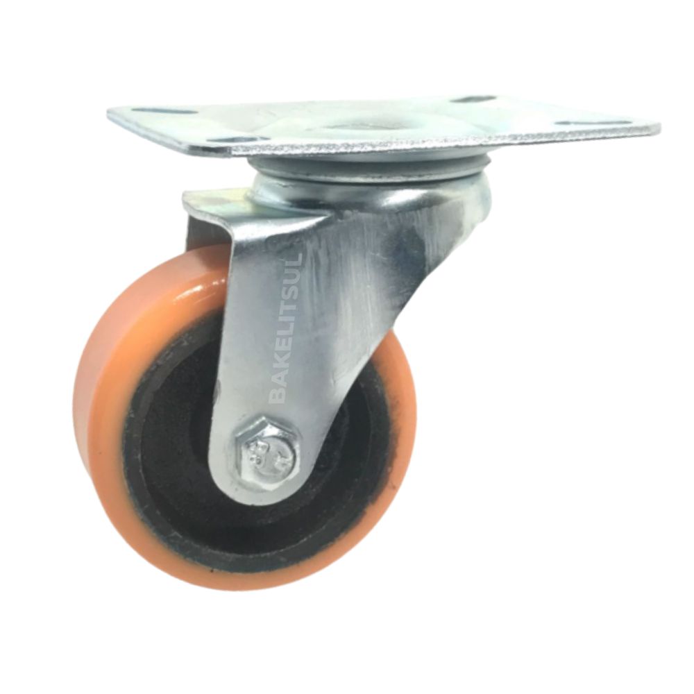 Suporte fabricado em chapa de aço carbono(*) estampado, acabamento zincado. Eixo da roda em aço carbono zincado parafusado. Roda com aro fabricado em ferro fundido com acabamento pintado preto . Banda de rodagem em poliuretano moldado.