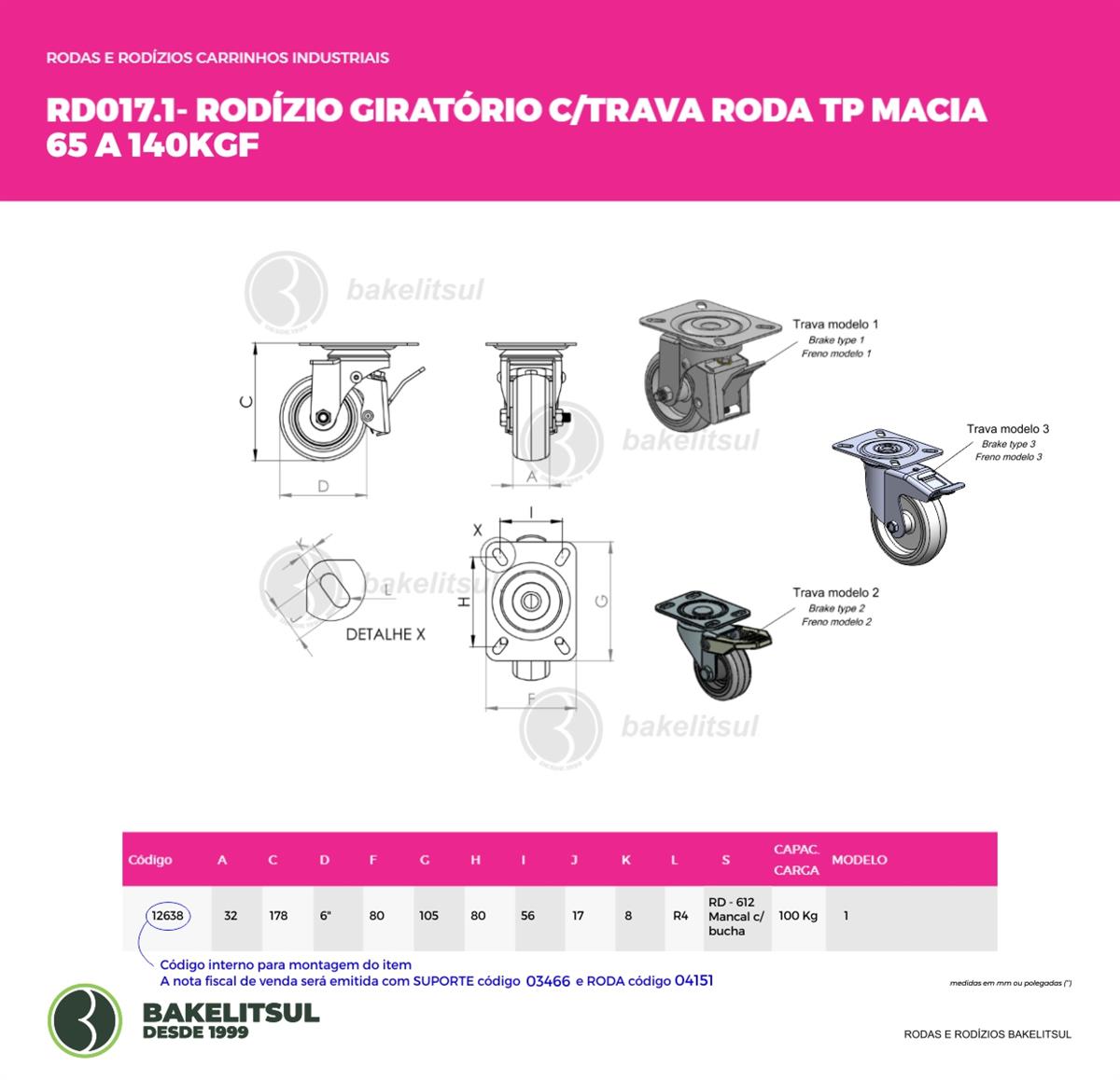 RODÍZIO GIRATÓRIO PLACA LINHA LEVE TRAVA 65 A 140KGF TP-GPLLT