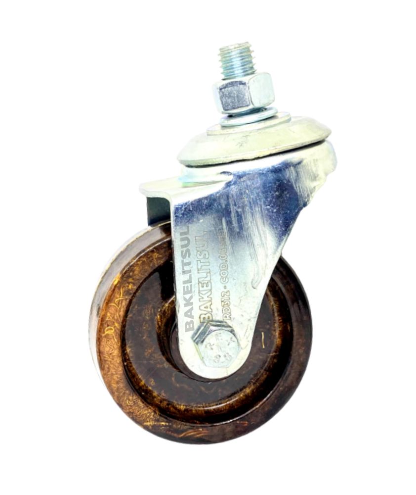 Suporte fabricado em chapa de aço carbono(*) estampado, acabamento zincado. Eixo da roda em aço carbono zincado parafusado. Roda fabricada em laminado fenólico(**) acabamento marrom.