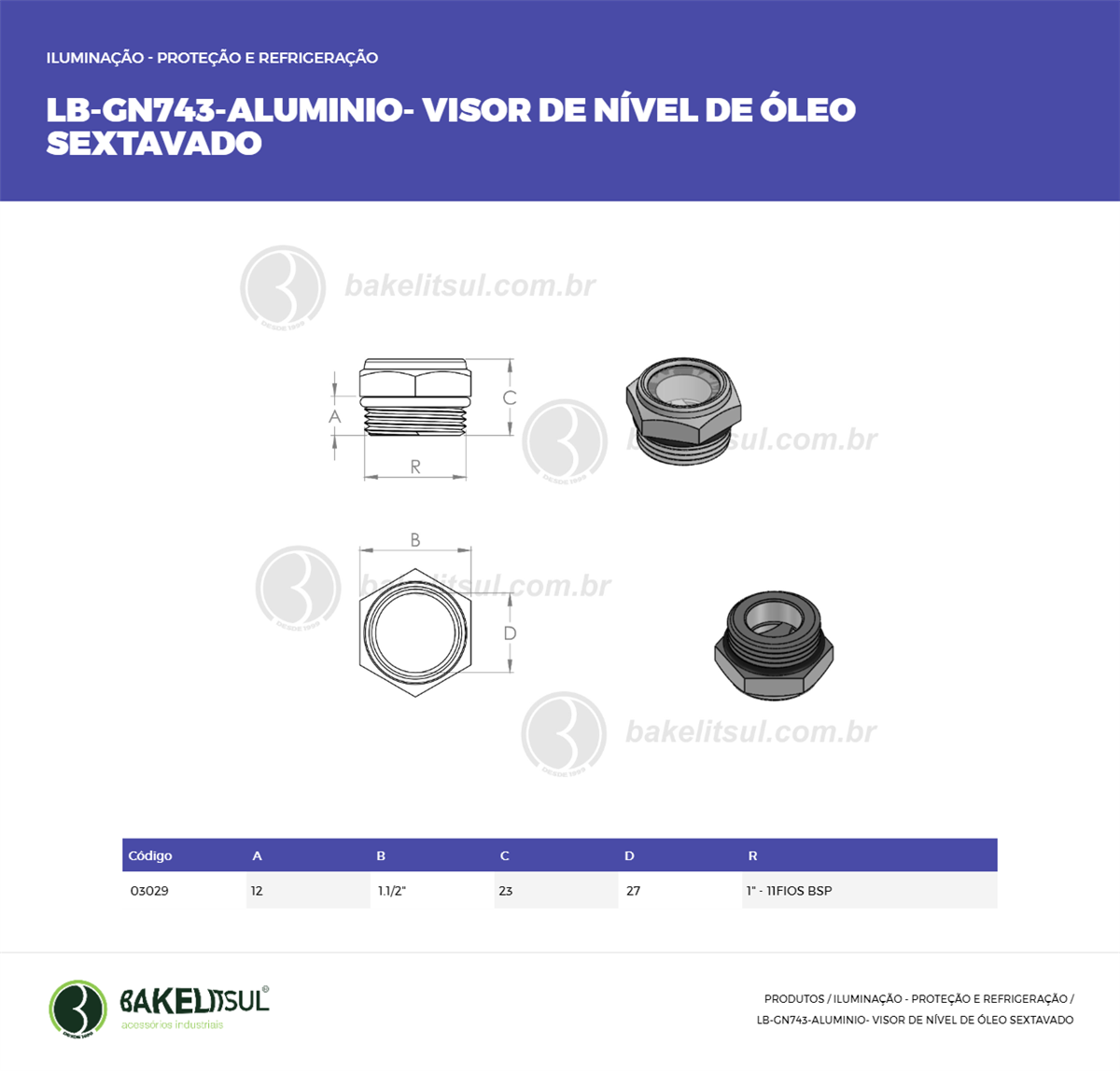 VISOR DE NÍVEL DE ÓLEO SEXTAVADO DE ALUMÍNIO LB-GN743